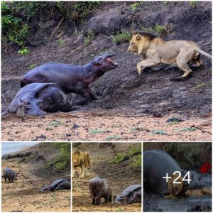 Es una escena desgarradora para presenciar: un hipopótamo bebé que intenta valientemente proteger a su madre enferma de un león macho, sin darse cuenta del verdadero peligro que se avecina….