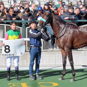 京都5Rを勝ったガンマジーティーピと武豊騎手(左から3人目、カメラ・山下 優) 12月7日の京都5R・2歳新馬(芝1200メートル=10頭立て)は、武豊騎手が騎乗した単勝1番人気のガンマジーティーピ(牡2歳、栗東・渡辺薫彦厩舎、父カレンブラックヒル)が、4角2番手から直線で脚を伸ばして抜け出した。1馬身1/4差の2着は2番人気ユキノエミリオ(三浦皇成騎手)。さらに3馬身差の3着は3番人気のアジアンテーラー(坂井瑠星騎手)が入った。勝ち時計は1分9秒7(良)。 武豊騎手は「素直な馬です。外に逃げるところがありましたが、直線でもう一回、脚を使ってくれました。芝でもダートでも良さそうです」と振り返った。 渡辺調教師は「内容は良かったですね。調教も坂路でしっかり動けていた馬。コーナーで外に張るところはありましたが、追ってからしっかり。血統的にこれくらいの距離と思います」と笑顔でコメントした。