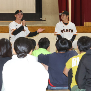 巨人・菊地大稀投手が6日、平内龍太投手とともに都内の小学校を訪問した。 約50人の小学6年生とキャッチボールなどで交流。少年時代について問われると「(野球を)始めた頃は同じ学年で10人ぐらいいたんですけど、一番へたくそでボールも相手まで届かないし、狙ったところに投げられないという感じで。でも負けたくない、僕もプロ野球選手になりたいという思いがあったので、一生懸命練習してどんどん上手になっていきました」と明かした。 また、少年少女へ向けては「僕は中学の時に元プロ野球選手の村田兆治さんという方から『諦めない心』という言葉をいただいて、夢を諦めないことを自分の中に持ち続けています」と語り、「努力をする過程を大切にすることがこれからの人生で何をするにしても大切だと思うので、本当に諦めずやり遂げることを大切にしてほしいなと思います」と呼びかけた。 自身は昨季50試合に登板したが、今季は1軍登板なし。来年は育成からの再出発となる。「どれだけ(春季キャンプ初日の)2月1日、『こいつは使いたい』と思ってもらえるかが重要だと思う。2月1日から10割で入れるようにしたいなと思っています」と早期の支配下復帰へ闘志を燃やした。