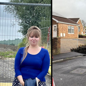 Picture of Plaid Cymru MSs Delyth Jewell and Peredur Owen Griffiths alongside a photo of the sinkhole posted on social media by Merthyr Tydfil council South Wales East MSs Delyth…