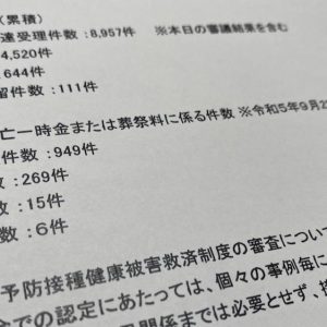予防接種の健康被害救済制度に基づき、新型コロナワクチン接種後に死亡した人の遺族による申請を受理した件数は、9月22日までに949件に上ることがわかった。厚生労働省が27日、健康被害の審査結果をまとめた資料で明らかにした。 同省はこれまで、健康被害の申請受理件数の総数は公表していたが、死亡事案の受理件数や認定件数は、国会で質問を受けた場合等を除き、公表してこなかった。筆者の情報開示請求に対しても6月分以降は不開示としてきたが、公表に転じた。 同省の審査会はこれまでに、接種後に心筋炎を発症し死亡した19歳の男性2人を含む269人の死亡事案について、被害認定をしている。一方で、650人以上の死亡事案が審査中となっている。 インフルエンザワクチン等の予防接種による死亡事案で厚労省が被害認定をしたのは、1977年以降の45年間であわせて151件だった。 コロナワクチンに関する受理件数、認定件数が異例の事態となっているが、大半の主要メディアは沈黙を保っている。 筆者作成 予防接種と健康被害の因果関係を審査しているのは、厚労省の「疾病・障害認定審査会」。 これまで、毎回「認定」「否認」等の審査結果を公表する際に、その時点での受理件数や認定件数も記載していたが、死亡事案や後遺障害事案の件数は明らかにしていなかった。 そうした中、厚労省は4月、国会での質問を受け、死亡事案の受理件数は「684件」と答弁(既報参照)。 厚労省は、筆者の情報開示請求に対しても、5月時点の情報を開示したが(5月26日時点で741件)、6月以降については不開示と通知した。 死亡事案の受理件数等の開示請求に対する不開示決定通知書 筆者の問い合わせに対し、厚労省の担当者は「国会議員から問い合わせがあれば(死亡事案の受理件数等を)集計、作成しているが、そのような問い合わせが来ない限り、作成することはない」と説明していた。 ところが、今回公表された資料には、死亡一時金・葬祭料の申請の受理件数、認定件数、保留件数が初めて記された。 これにより、死亡事案のうち審査が終わったのは約3割、死亡以外の事案のうち審査が終わったのは約6割であることが確認された。 筆者作成 健康被害の審査結果を軽視する言説に注意 厚労省は、健康被害救済制度による被害認定について「厳密な医学的な因果関係までは必要とせず、接種後の症状が予防接種によって起こることを否定できない場合も対象」と説明している。このことをとらえ、予防接種と無関係な事案も認定対象になっているかのように示唆する言説が一部にみられる。 しかし、「厳密な因果関係までは必要としない」というのは、「いい加減な判断でよい」「因果関係がなさそうでも認める」ということを意味するわけではない。 そもそも日本では解剖が行われる事例も少ないうえ、個々人の接種と有害事象の因果関係を医学的に厳密に証明することは不可能に近いと言われている。 そうしたことを踏まえ、厚労省の資料には、接種時の健康状態や接種前後の状況を総合的に考慮し「一般人をして疑問を差し挟まない程度の蓋然性があると認められる場合」に認定するものであって「因果関係に疑義のあるものを広く救済するものではない」と記されている。 医学的な解明力不足などを理由に、現実に起こり得る健康被害の救済を妨げないように証明負担を軽減する趣旨であって、因果関係のなさそうなものまで広く救済する趣旨ではないということだ。 厚生労働省「疾病・障害認定審査会」資料(2021年12月9日)より一部抜粋 申請段階では、厚労省は「予防接種を受けたことにより死亡したことを証明することができる医師の作成した診療録」の提出を求めており(同省サイト)、申請のハードルも決して低くない。受理業務を担当する地方自治体が、書類不足を理由に受け付けないケースもあるという(山岡淳一郎『ルポ 副反応疑い死』)。 受け付けされた後は、医師や感染症専門家ら専門委員で構成されている審査会が、申請者が提出したカルテ等に基づき判断し、「予防接種と疾病との因果関係について否定する論拠がある」ケースや「因果関係について判断するための資料が不足しており、医学的判断が不可能である」ケースには否認することになっており、そうした理由にあたらない場合にはじめて認定される。あくまで専門委員が認否の判断をしており、厚労大臣は審査に直接関与しない。 とりわけ死亡事案の認定は、予防接種法に基づき、死亡が「接種によるもの」と厚生労働大臣が因果関係を認め、死亡一時金(4420万円。今年4月から4530万円に増額)の給付に直結する、きわめて重い判断だ。給付金は地方自治体も一部負担する。 重大な死亡、後遺障害事案は審査結果が出るまでに時間かかっており、専門委員が医学的見地から慎重に検討し、認否の判断を出しているとみられる。 しかし、これまでのところ、接種の安全性を評価する別の専門部会では、健康被害救済制度の審査内容が共有されて