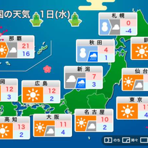 ■ 天気のポイント ■ ・北日本や北陸は積雪急増や吹雪に注意・太平洋側は初日の出が見られそう・関東は気温差に注意 正月らしい寒さ 明日、2025年1月1日(水)の日本付近は冬型の気圧配置になります。再び寒気が流れ込んでくるため北陸や北日本の日本海側は雪の強まりに注意が必要です。太平洋側は晴れるところが多く初日の出も期待出来ますが、昼間も風が冷たく感じそうです。 北日本や北陸は積雪急増や吹雪に注意 北日本の日本海側は雪の降るところが多く、局地的な積雪の急増に注意が必要です。風も強く吹くため、吹雪による視界不良にも注意してください。北陸は雨や雪で、山沿いではさらに積雪が増える見込みです。各地とも気温はあまり上がらず、真冬の防寒が必須です。 太平洋側は初日の出が見られそう 関東以西の太平洋側の各地は元日も晴れて日差しが届きます。多少雲の出るところはありますが、多くの場所で初日の出が期待できそうです。昼間も風が冷たく感じられます。初詣などはしっかりとした寒さ対策をしてお出かけください。 関東は気温差に注意 正月らしい寒さ 今日、大みそかに気温が15℃前後まで上がった関東では、元日はお正月らしい寒さが戻ります。朝の冷え込みはさほど強くはないものの、昼間の最高気温はかなり低くなる予想です。寒さ対策が欠かせません。