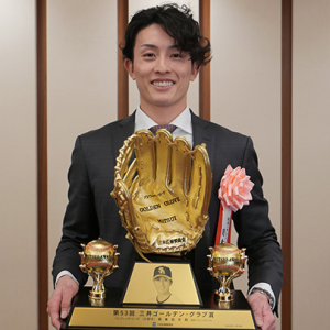 福岡ソフトバンクホークス 周東佑京選手 ©PLM 11月28日、第53回三井ゴールデン・グラブ賞の表彰式が行われ、セ・パ17名の選手(モイネロ投手は欠席)に、栄誉ある金色(こんじき)のグラブ型のトロフィーが授与された。 パ・リーグ遊撃手最多受賞となった源田壮亮選手や、今回最多得票数を獲得し、表彰式では全身“ゴールデン”に身を包んで会場を騒然とさせた辰己涼介選手など、おなじみの顔ぶれに加え、パ・リーグの選手の初受賞者は5名とフレッシュな顔ぶれとなった。 ©PLM さらにリーグ優勝の福岡ソフトバンクからは5名が受賞。この両方に該当する、外野手部門で選出された周東佑京選手は、プロ入り7年目でうれしい初受賞となった。 周東選手は壇上で、「プロ野球に入って一番欲しかった賞」と受賞の喜びを明かし、選手層の厚いホークスで、外野守備の要であるセンターのポジションを勝ち取った今季を振り返って「(今季は)センター1本でいかせていただいたのでやりやすかったです」と話した。 一方でファンの記憶には俊足・周東選手と、鉄壁の守備を誇る三井ゴールデン・グラブ賞受賞者の「矛楯対決」も強く残っているだろう。この日も話題に挙がったのは、7月14日の北海道日本ハム戦の7回表、2死二塁の場面。ライトへのヒットで二塁ランナーの周東選手が一気に本塁へ駆け抜けるも、万波中正選手のドンピシャ送球で本塁アウトになったという場面だ。同じく外野手部門で受賞した万波選手との戦いの振り返りを求められると、「無駄なく走っていたので(刺した万波選手が)すごいなと思いました」と話す。 そのコメントをうけて万波選手は、「球の強さも投げる位置も満点だったと思います」と自画自賛。正真正銘のライバルである周東選手のことは「一塁、二塁どこにいても緊張感のある選手」と讃えた。 ©PLM パーソル パ・リーグTVでは、初受賞の喜びのさなかにある周東選手に独占インタビュー。守備のこだわり、三井ゴールデン・グラブ賞への思いを語る。後日公開のこちらもぜひご覧いただきたい。 取材・文 海老原悠 ・三井ゴールデン・グラブ賞受賞者の愛用品にはどんなこだわりが? レジェンドたちのグラブに野球殿堂博物館で出合う ・一流の守備職人による野球教室。参加者のとある共通点とは…? 西崎幸広が語る三井ゴールデン・グラブ賞OBの知られざる活動 ・「第53回三井ゴールデン・グラブ賞」パ・リーグ受賞選手