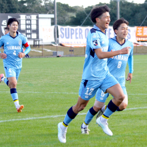 ◇サッカー高円宮杯U-18プリンスリーグ東海 最終節 磐田Uー18 4-2 清水ユース(30日・ゆめりあサッカー場) ジュビロ磐田U―18が首位・清水エスパルスユースとの「静岡ダービー」を4―2で制した。磐田は前半7分にMF川合徳孟(3年)の3戦連続ゴールで先制すると、後半も3点を追加した。得失点差で届かず逆転Vは逃したが、2位でプレミアリーグプレーオフ(PO)の切符をつかんだ。 試合終了の笛に、磐田イレブンはハイタッチを交わした。PO進出を決めたことよりも、清水を倒したことがうれしかった。今季はクラブユース東海大会などで宿敵に3連敗。「絶対に勝つ、という気持ちだった」とDF渥美慶大主将(3年)が言えば、川合も「先制点が大事になると思っていた」と3戦連発を喜んだ。 清水とは勝ち点で3差、得失点差が9あった。5点差で勝てば逆転優勝。かすかな希望に向かって選手は突き進んだ。後半3分、川合のスルーパスからMF高沢海志(2年)が加点すれば、同19分のFKからDF甲斐佑蒼(2年)が今季初ゴール。3―0だ。 最終的に2点差勝利で、優勝には届かなかったが、「チームにとって大きな勝利。次に向けて自信になります」と甲斐は胸を張った。トップチームはこの日の逆転勝利でJ1残留へ踏みとどまった。弟たちも来週のPOでプレミア復帰を決めてみせる。 (里見 祐司) 〇…まさかの4失点にイレブンは清水ユースの選手たちは肩を落とした。1―4の後半36分にMF矢田龍之介(3年)がミドルシュートを豪快に突き刺したが、「勢いにのまれた。優勝した感じがしない」と首を振った。それでも「優勝は優勝。選手はよくやった」と沢登正朗監督(54)。初戦敗退した昨年のPOを、この日のスタメンのうち8人が経験しており、指揮官は「独特の雰囲気を乗り越えたい」と必勝を期した。