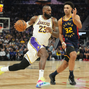 Jan 25, 2025; San Francisco, California, USA; Los Angeles Lakers forward LeBron James (23) dribbles against Golden State Warriors forward Trayce Jackson-Davis (32) during the second quarter at Chase Center….