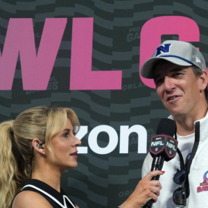Feb 2, 2025; Orlando, FL, USA; ESPN reporter Laura Rutledge interviews NFC coach Eli Manning during the 2025 Pro Bowl Games at Camping World Stadium. Mandatory Credit: Kirby Lee-Imagn Images…