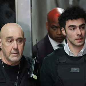 Luigi Mangione winks at supporters with green sweater under bulletproof vest