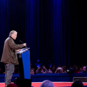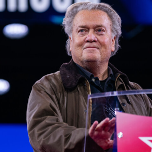 Stephen K. Bannon, a former White House official and conservative podcast host, was wrapping up a speech to a right-wing audience outside Washington on Thursday when he made a gesture…