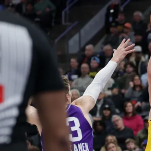Feb 12, 2025; Salt Lake City, Utah, USA; Los Angeles Lakers guard Luka Doncic (77) shoots over Utah Jazz forward Lauri Markkanen (23) during the second quarter at Delta Center….