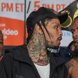 NEW YORK, UNITED STATES – FEBRUARY 28: WBA Super Featherweight World Champion Lamont Roach and WBA … [+] Lightweight World Champion Gervonta “Tank” Davis faceoff at the weigh-in event ahead…