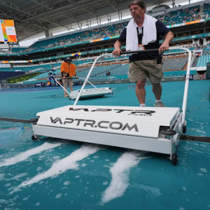 1 / 5 A crew dries the court after a break in rain that had delayed play by several hours, at the Miami Open tennis tournament, Sunday, March 30, 2025,…