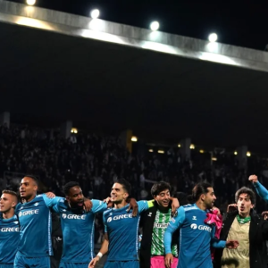 Los jugadores del Betis, abrazados, celebran mirando a los aficionados el pase a los cuartos de final de la Conference League Reuters No dio ningún minuto de descuento el árbitro…