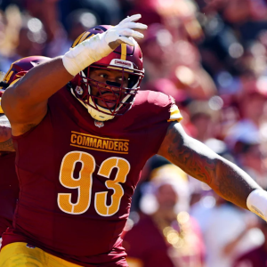 Oct 6, 2024; Landover, Maryland, USA; Washington Commanders defensive tackle Jonathan Allen (93) celebrates after a tackle during the second quarter against the Cleveland Browns at NorthWest Stadium. Mandatory Credit:…