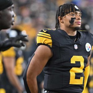 Oct 28, 2024; Pittsburgh, Pennsylvania, USA; Pittsburgh Steelers quarterback Justin Fields (2) watches the action during the first quarter of a game against the New York Giants at Acrisure Stadium….