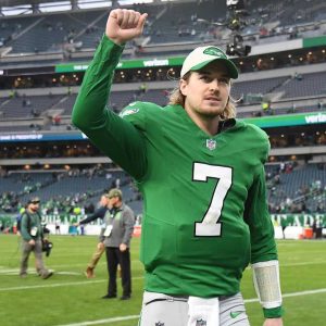 Dec 29, 2024; Philadelphia, Pennsylvania, USA; Philadelphia Eagles quarterback Kenny Pickett (7) walks off the field after win against the Dallas Cowboys at Lincoln Financial Field. Mandatory Credit: Eric Hartline-Imagn…