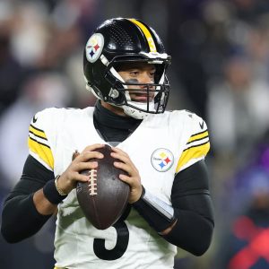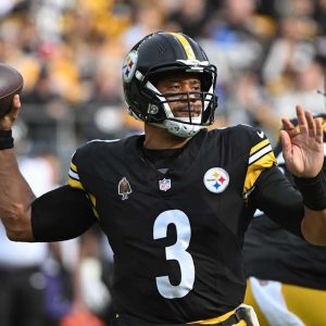 Nov 17, 2024; Pittsburgh, Pennsylvania, USA; Pittsburgh Steelers quarterback Russell Wilson (3) throws a pass against the Baltimore Ravens during the first quarter at Acrisure Stadium. Mandatory Credit: Barry Reeger-Imagn…