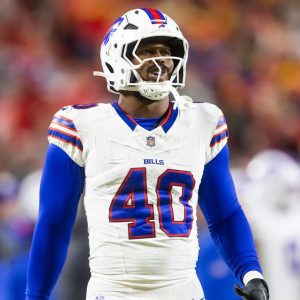 Jan 26, 2025; Kansas City, MO, USA; Buffalo Bills linebacker Von Miller (40) against the Kansas City Chiefs during the AFC Championship game at GEHA Field at Arrowhead Stadium. Mandatory…