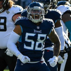 Dec 12, 2021; Nashville, Tennessee, USA; Tennessee Titans linebacker Harold Landry (58) celebrates the sack against the Jacksonville Jaguars during first half at Nissan Stadium. Mandatory Credit: Steve Roberts-Imagn Images…