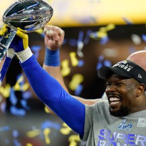 Los Angeles Rams outside linebacker Von Miller (40) raises the Vince Lombardi Trophy after Super Bowl 56 between the Cincinnati Bengals and the Los Angeles Rams at SoFi Stadium in…