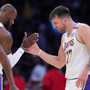 Luka Doncic, right, celebrates with LeBron James after scoring during the first half of the Lakers’ 108-102 win over the Clippers at Crypto.com Arena on Sunday night. James finished the…