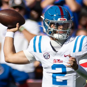 Nov 23, 2024; Gainesville, Florida, USA; Mississippi Rebels quarterback Jaxson Dart (2) throws the ball against the Florida Gators during the first half at Ben Hill Griffin Stadium. Mandatory Credit:…