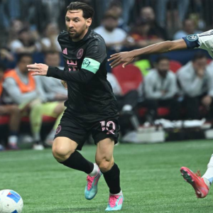 Apr 24, 2025; Vancouver, British Columbia, CAN; Vancouver Whitecaps FC midfielder Ali Ahmed (22) reaches out to grab Inter Miami SC forward Lionel Messi (10) during the first half at…