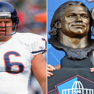 Steve McMichael #76 of the Chicago Bears during a game on October 31,1993 in Green Bay, Wisconsin ; Misty McMichael poses with the bronze bust of Steve McMichael during the…