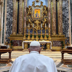 El Papa Francisco rezó ante el icono de la Virgen María, Salus Populi Romani en la Basílica de Santa María la Mayor, tras salir de su internación (Vatican Media/Handout via…