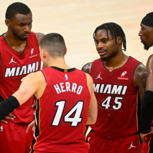 The Miami Heat gather in front of the bench during a timeout in the fourth quarter against the Cleveland Cavaliers at Rocket Arena. David Richard David Richard-Imagn Images CLEVELAND The…