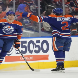 Evan Bouchard pots two, including tying goal in dying seconds of third period before Leon Draisaitl closes out win in OT. Edmonton Oilers Corey Perry (90) celebrates a goal scored…