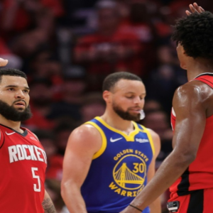 Fred VanVleet and Amen Thompson of the Houston Rockets high five in front of Golden State star Stephen Curry during the Rockets’ victory over the Warriors in game five of…