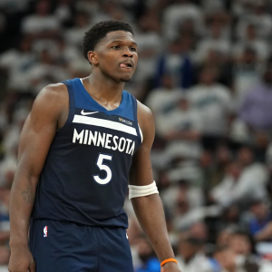 May 26, 2025; Minneapolis, Minnesota, USA;Minnesota Timberwolves guard Anthony Edwards (5) reacts against the Oklahoma City Thunder in the first half during game four of the western conference finals for…