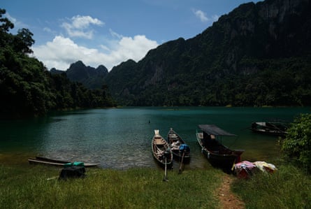 Boats on the bank of Cheow Lan Lake. Photograph: Leigh Griffiths
