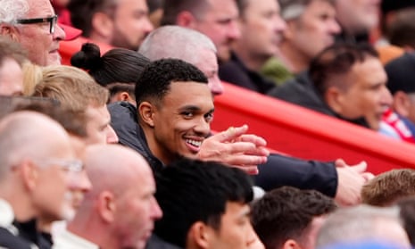 Watching on: Liverpool’s Trent Alexander-Arnold sits behind the bench. Photograph: Peter Byrne/PA