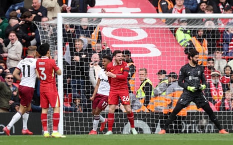 67 mins: Another West Ham chance! Bowen is played through, surely just offside, and Alisson’s first run off his line seems to take him out of position, but he corrects himself by the time Bowen looks up, and couldn’t have been in a better place to get in the way of the eventual shot.