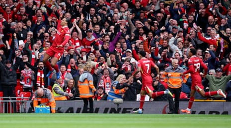 90+4 mins: West Ham hit the bar now! Kilman crosses, and Fullkrug stoops to send in a very nicely-judged header that hits the bar and rebounds to safety! “If Liverpool do indeed win this despite their second half performance, they will deserve to end up as champions,” writes John Swan. “It’s a well-worn trope that top teams find ways to win despite everything, and Liverpool have had that in spades this season, whereas my team, Arsenal, haven’t (as yesterday’s result showed again). But what is it? Part luck maybe, but mainly I guess bloody-mindedness mixed with enough residual organisation to stumble over the line when the fluency has gone.”