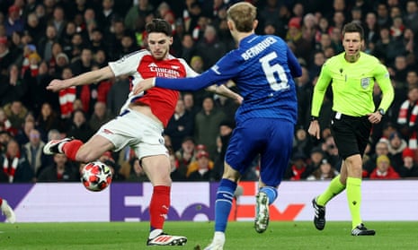 Arsenal’s Declan Rice thumps the ball into the net to give the home side an early lead. Photograph: Toby Melville/Reuters