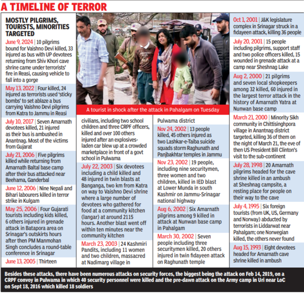 Tuesday’s attack adds to a grim list of assaults in the region: more than 30 were killed and 60 wounded in a 2000 attack on the Amarnath base camp. In 2001, 13 were killed and 15 wounded in a similar attack on Amarnath pilgrims at Sheshnag, followed by another assault in 2002 that left 11 dead. In 2017, eight pilgrims were gunned down while returning from the Amarnath shrine. Most recently, a tourist couple from Rajasthan was injured in a shooting in Pahalgam in May 2023.