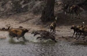 Los perros salvajes se enfrentan a las hienas en feroces batallas por el territorio, lo que finalmente obliga a los perros salvajes a retirarse.
