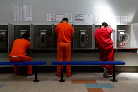 Detainees talk on telephones at the Adelanto ice processing center in Adelanto, California, in August 2019. Photograph: Chris Carlson/AP