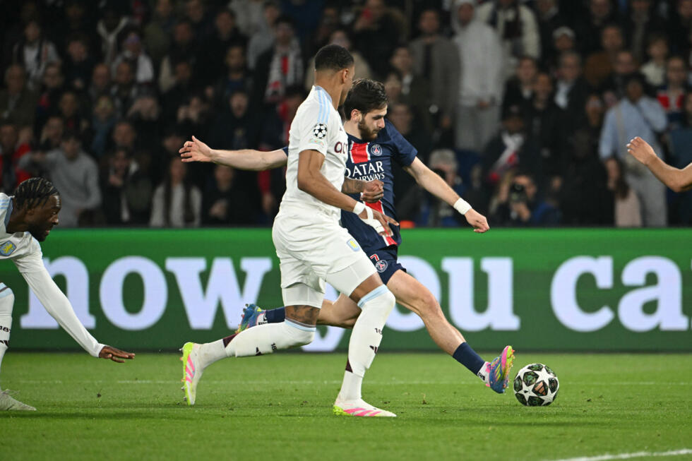 L’attaquant géorgien du PSG Khvicha Kvaratskhelia balle au pied contre Aston Villa en quart de finale aller de Ligue des champions le 9 avril 2025 au Parc des Princes à Paris © Bertrand GUAY / AFP