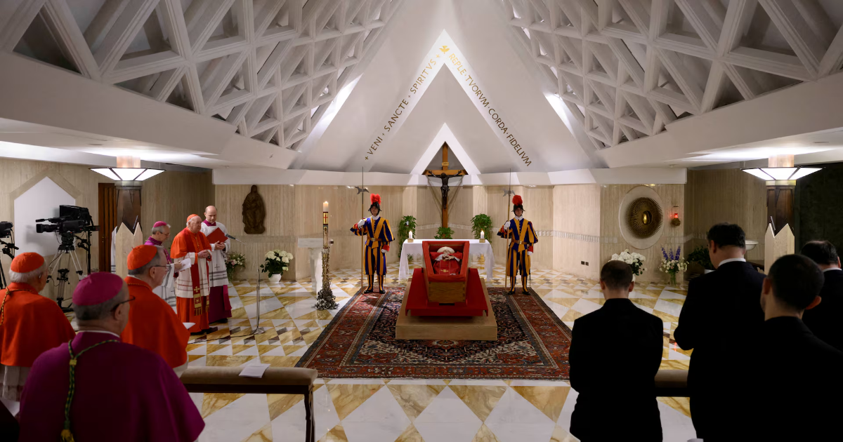 Item 1 of 10 The body of Pope Francis is placed in an open casket during the rite of the declaration of death in Santa Marta residence at the Vatican, April 21, 2025. Vatican Media/Handout via REUTERS