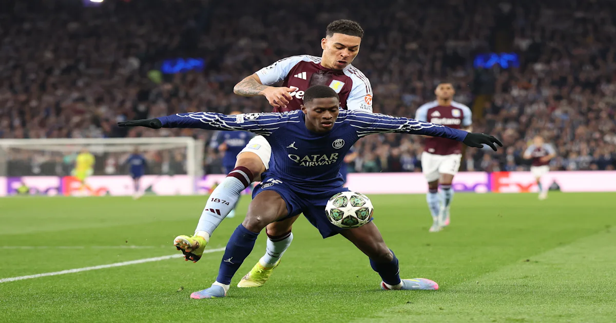 BIRMINGHAM, ENGLAND – APRIL 15: Morgan Rogers of Aston Villa and Ousmane Dembele of Paris Saint Germain during the UEFA Champions League 2024/25 Quarter Final Second Leg match between Aston Villa FC and Paris Saint-Germain at Villa Park on April 15, 2025 in Birmingham, England. (Photo by Catherine Ivill – AMA/Getty Images)