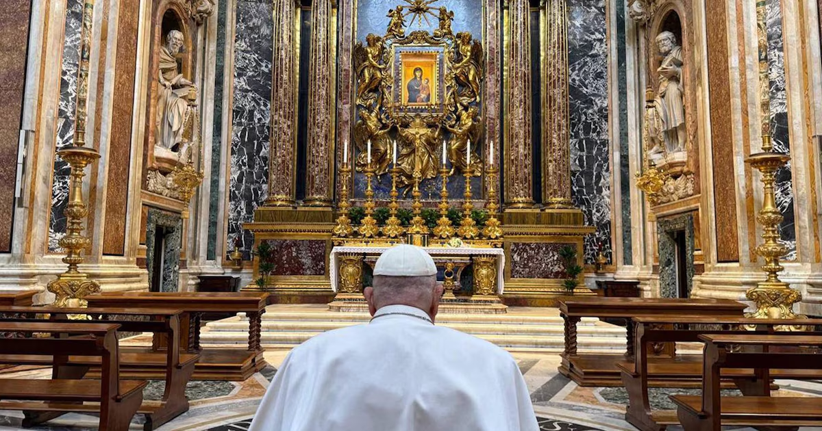 El Papa Francisco rezó ante el icono de la Virgen María, Salus Populi Romani en la Basílica de Santa María la Mayor, tras salir de su internación (Vatican Media/Handout via REUTERS)