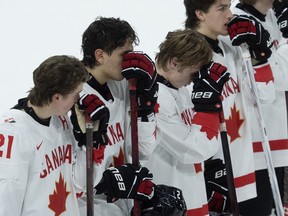 Canada players show their disappointment as they stand together following their 4-3 loss to Czechia at the end of IIHF World Junior Hockey Championship quarterfinal action in Ottawa, Thursday, Jan. 2, 2025. Adrian Wyld/THE CANADIAN PRESS Photo by Adrian Wyld /The Canadian Press