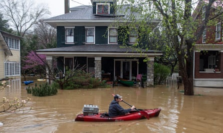John Clayton, 56, carries his cat in a kayak as the Kentucky River begins to flood his house in Frankfort, Kentucky. Photograph: Michael Swensen/Getty Images
