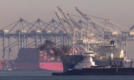 Pollution rises from a ship cruising by the Port of Long Beach, California. Photograph: Étienne Laurent/AP