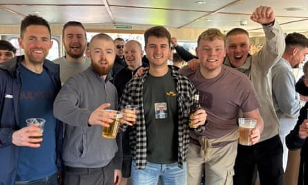 Evan Johnston (center) is welcomed onboard by Southend United soccer fans during the boat trip in London on Saturday. Photograph: Andy Ward