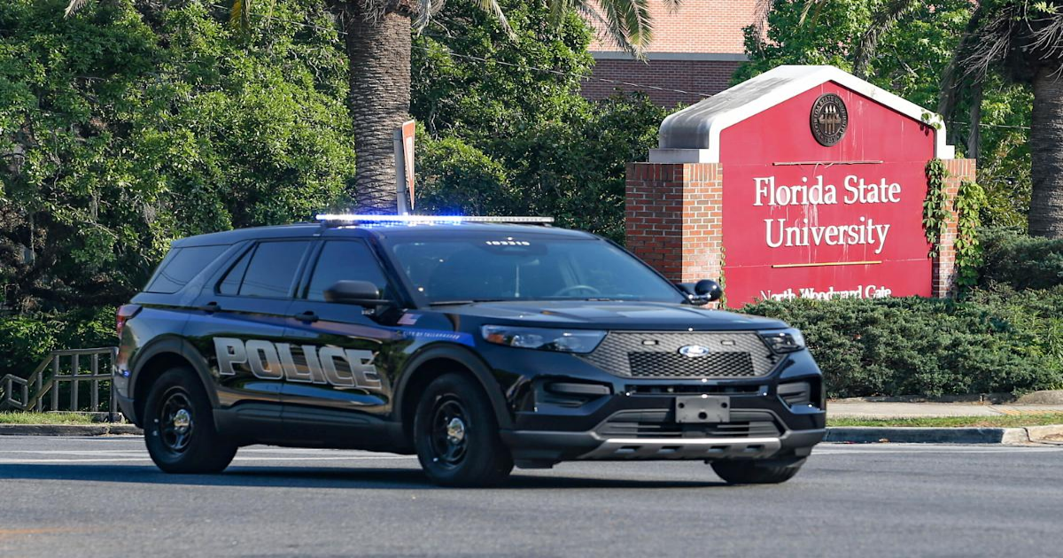 The FSU student union building is seen behind a law enforcement vehicle on Thursday. (Gary McCullough/AP)
