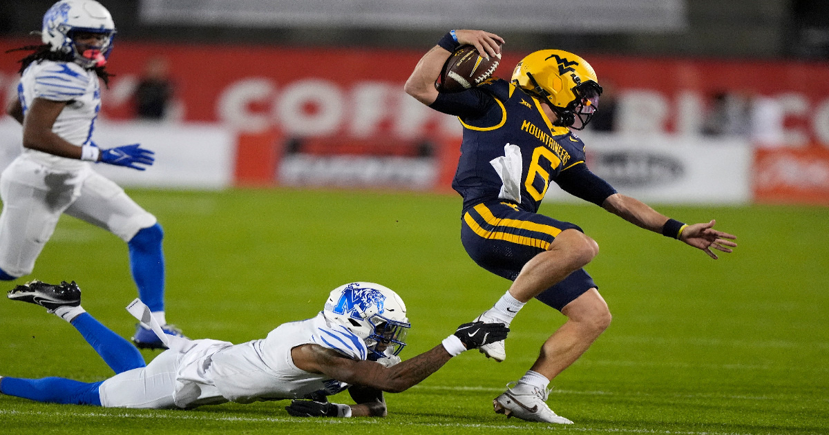 West Virginia quarterback Garrett Greene (6) tries to run out of the grasp of Memphis defensive back Kobee Minor during the Scooters Coofee Frisco Bowl, Dec. 17, 2024, in Frisco, Texas. Minor was the last pick in the 2025 NFL Draft. (AP Photo/LM Otero, File)